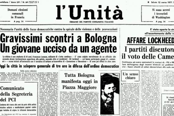 Venerdì 11 marzo 1977 ci sono scontri fra il servizio d’ordine di Comunione Liberazione ed il Movimento ’77. Viene chiamata la polizia, cariche, fughe, lacrimogeni, molotov, incursioni, un poliziotto si piega sulle ginocchia, prende la mira e spara. Muore un giovane di 25 anni Francesco Lorusso. Un poliziotto si piega sulla ginocchia, prende la mira e spara. Il giorno dopo, 12 marzo, una irruzione della polizia chiude la voce di Radio Alice, la Voce del Movimento aperta circa un anno prima. Tutto viene documentato in diretta radio. Un poliziotto si piega sulla ginocchia, prende la mira e spara.