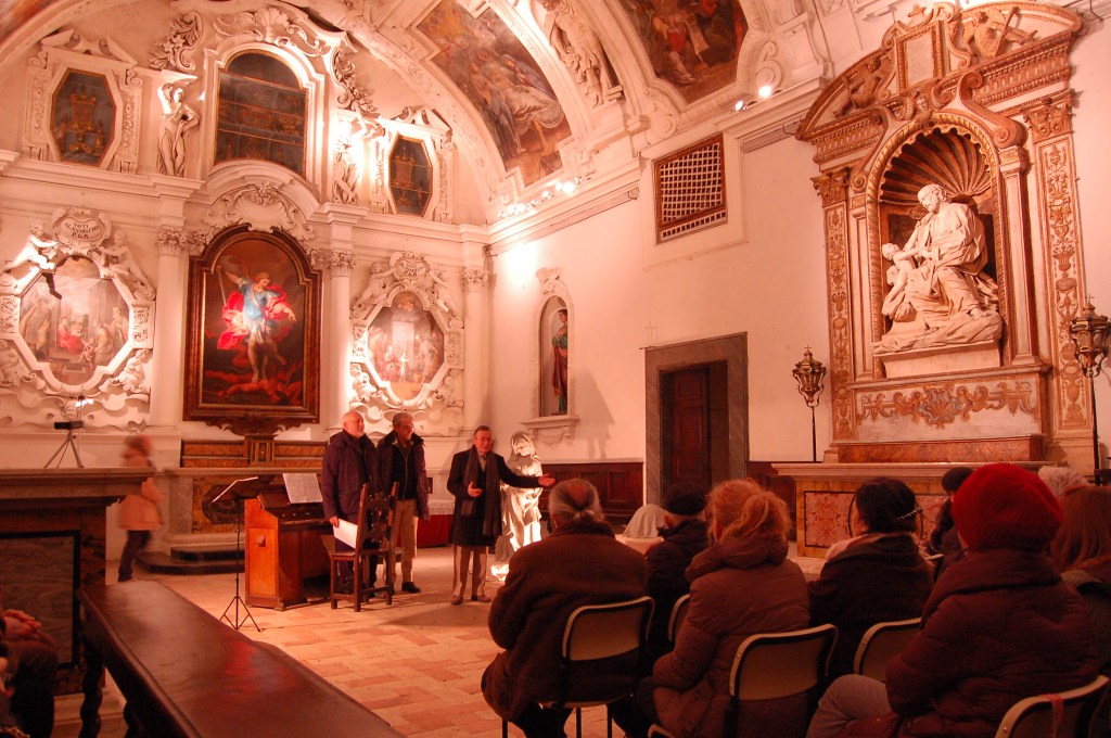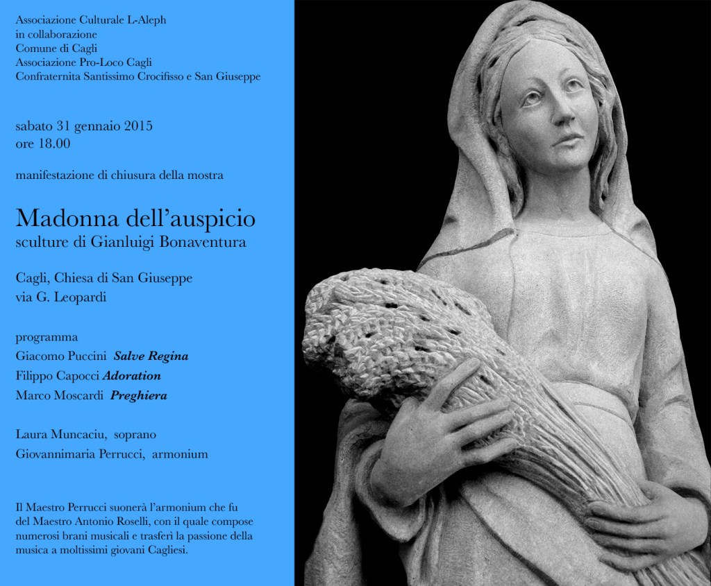 Poi nel 2015 lo scultore Gianluigi Bonaventura espone in una bellissima chiesa una sua scultura rappresentante la Madonna dell’auspicio. Non c’è miglior luogo dove inserire nel programma la Preghiera d’Amore. Viene arrangiata per Armonium e suonata dal M° Giovannimaria Perrucci e cantata dalla soprano Laura Muncaciu. Con la grande disponibilità di Giuseppe Aguzzi nel curare al meglio gli spazi della chiusa e nella ricerca dei mezzi musicali.