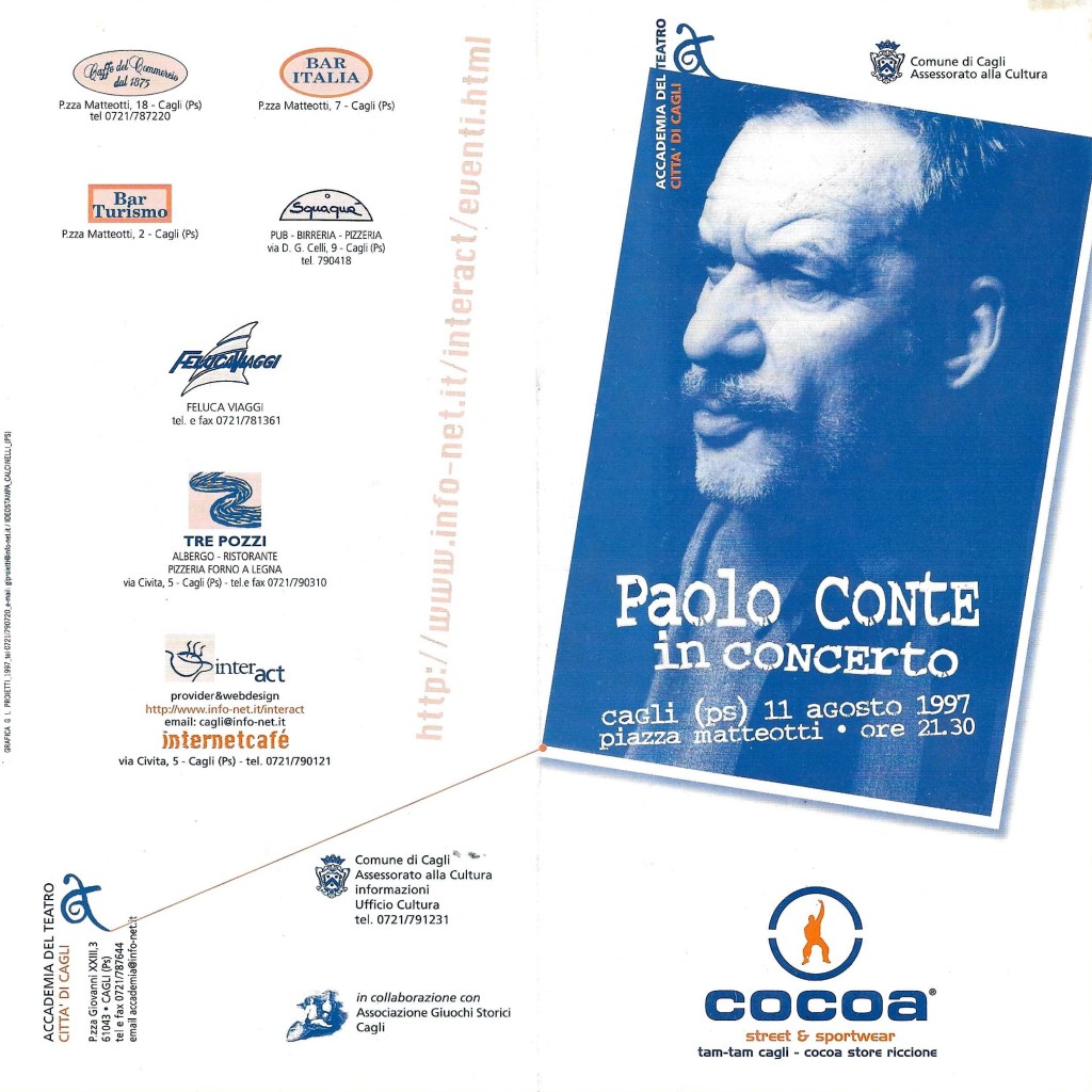 Quindi l’11 agosto 1997 organizziamo il Concerto di Paolo Conte in Piazza Matteotti a Cagli con le gradinate montate per il Palio dell’oca.