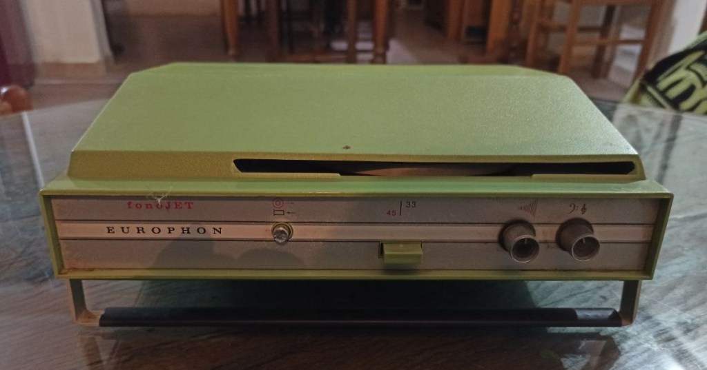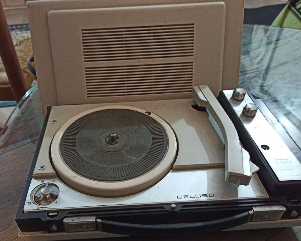 Il mangiadischi, mitico degli anni ’60. Quello che i nostri genitori portavano in spiaggia, simbolo del divertimento e del decennio del boom economico e della spensieratezza.